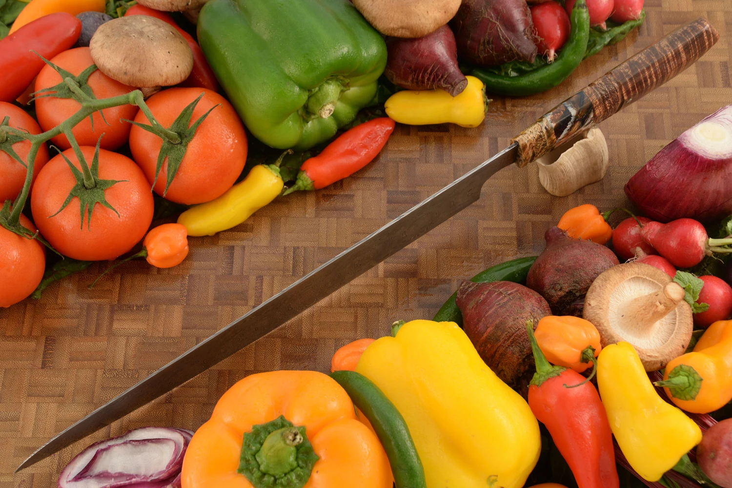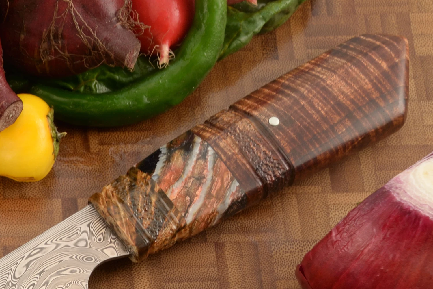 Damascus Chef’s Slicer With Koa, Birch, And Mammoth Molar