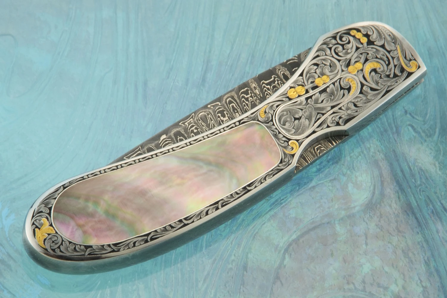 Engraved Auto Backlock Interframe With Blacklip Mother Of Pearl, Damascus And Gold Inlay