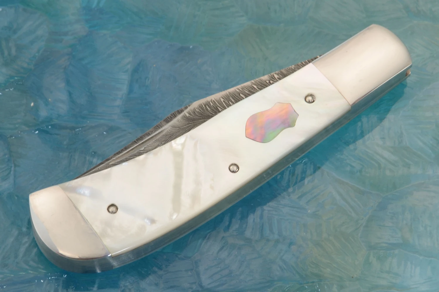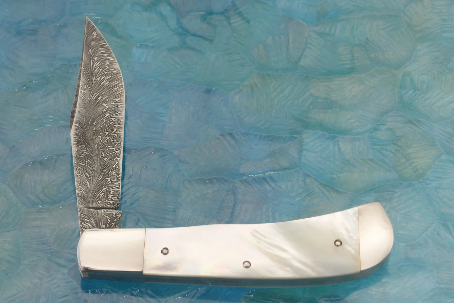River Of Fire Damascus Slipjoint Trapper With Whitelip And Blacklip Mother Of Pearl