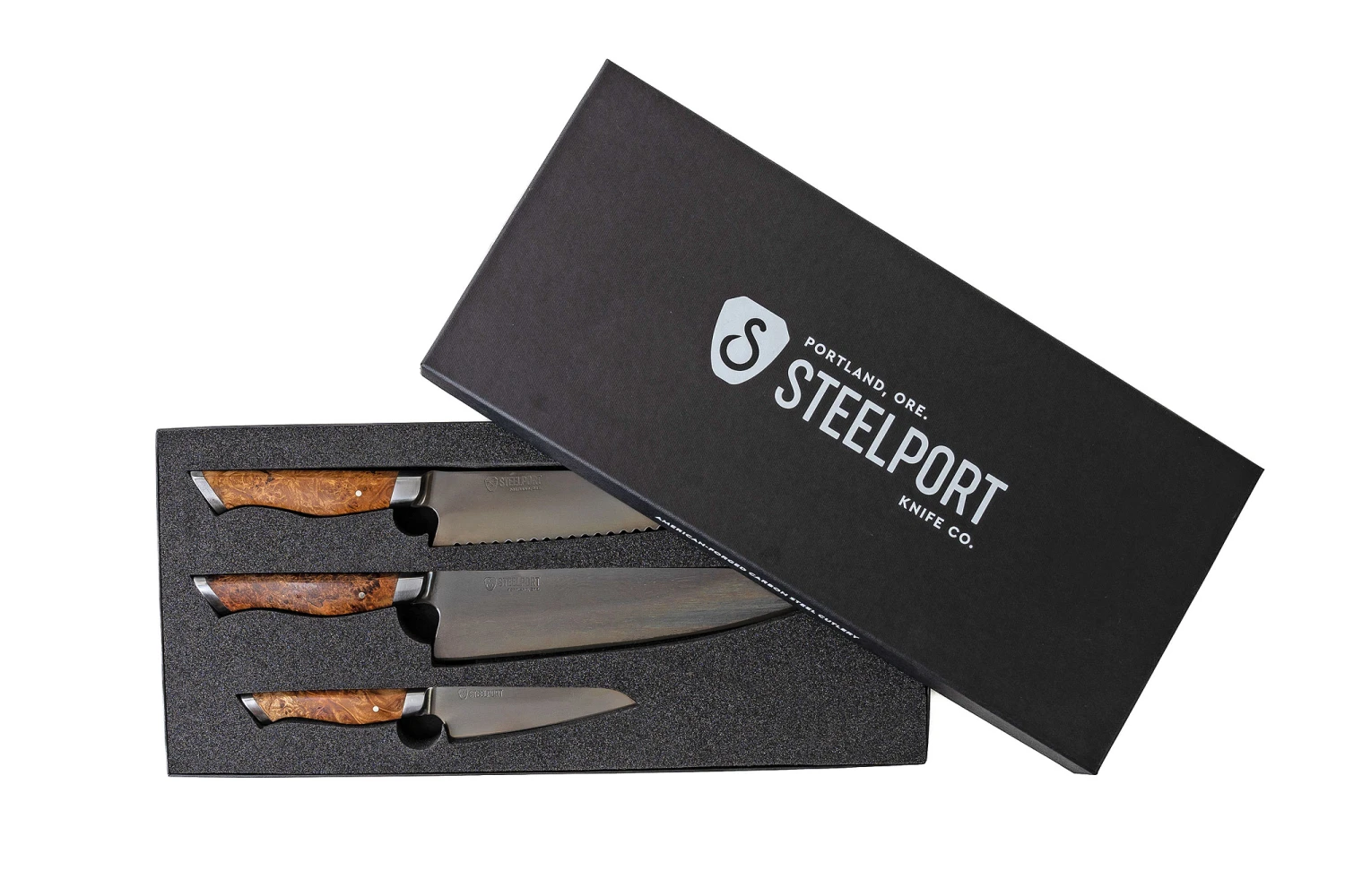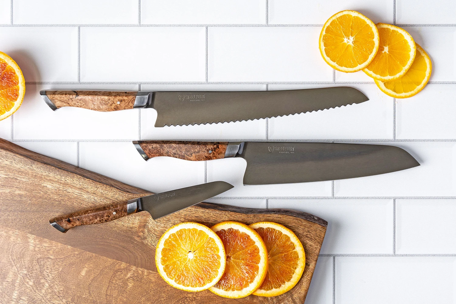 Three Knife Gift Set – Chef Knife (8 In.), Parer (4 In.), Bread Knife (10 In.) With Bigleaf Maple Burl – 52100 Carbon Steel